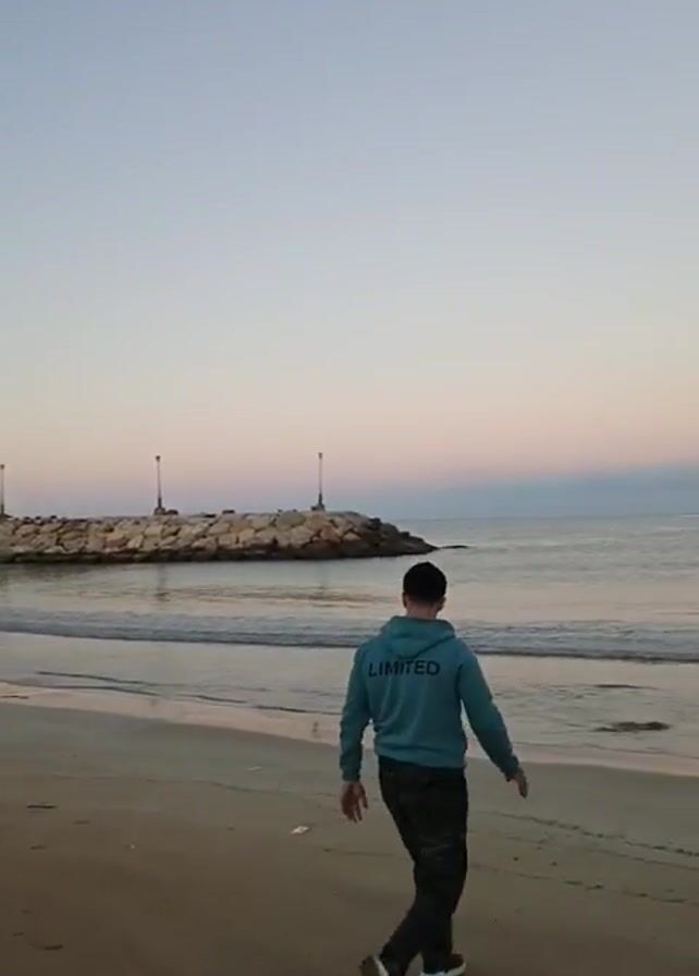 A man walks away from the camera, toward a beach and the ocean. He is wearing a light blue hoodie with the word "LIMITED" on the back, and dark pants. The beach is sandy and the waves are small. In the distance, there is a pier of rocks with lights on it. The sky is a clear light blue at the top, fading into a pinkish hue near the horizon. A ship can be seen in the distance.