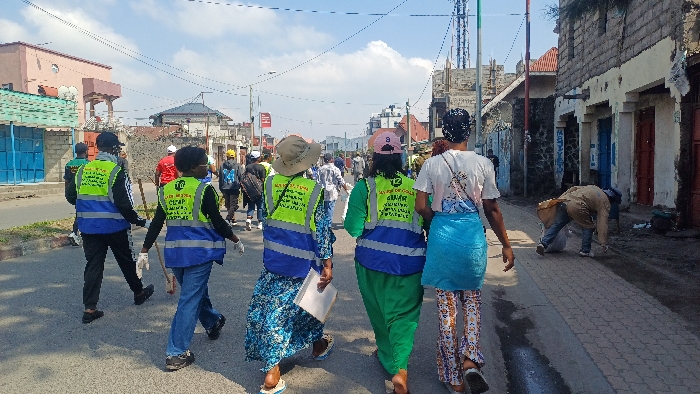 This image depicts an urban street scene in Gisenyi, Rwanda, featuring an organized clean-up activity under a clear, bright sky