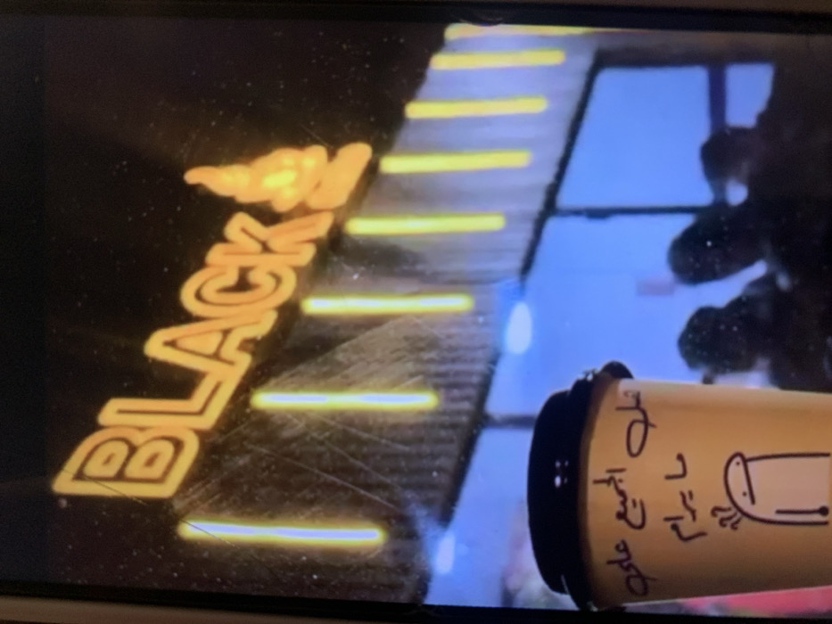 The image displays a yellow disposable coffee cup with a black lid positioned in the foreground, offset to the lower-left. The cup features black Arabic text that translates to "Tell everyone it's okay" and "It's okay," along with a simple, white stick-figure-like drawing (Flork of Cows meme) with two question marks above its head. In the background, the exterior of a commercial establishment, identified as being in Ma'raba, Syria, is visible. A prominent yellow neon sign displays the word "BLACK" in capital letters, accompanied by a smaller, abstract yellow, flame-like or conical logo to its right. Below the main sign, a series of vertical yellow neon light strips illuminate the building's facade. Through large windows or glass panels beneath these lights, indistinct silhouettes of at least three individuals are faintly discernible inside the establishment, suggesting it is a cafe or similar venue during nighttime or in a dimly lit setting. The overall image exhibits characteristics of a photograph taken of a digital screen, including glare and numerous diagonal scratch-like artifacts across the frame.