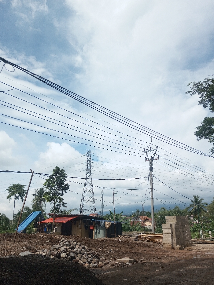 A daytime outdoor shot depicts a rural landscape dominated by power lines stretching across a cloudy sky. Below, a scene of apparent construction includes piles of gravel, lumber, and concrete blocks. A makeshift dwelling with a blue tarp and red roof is visible. An electrical tower stands in the mid-ground. Vegetation, including trees and coconut palms, provides a backdrop, suggesting a tropical or subtropical environment. A mountain range is slightly visible in the background.