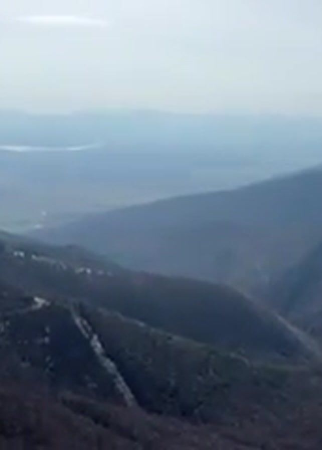 panoramic view of a mountainous landscape, partially obscured by a hazy sky. The mountains are covered with trees, some bare and some with remnants of snow. A ridge is visible, with a group of people gathered on top. In the foreground, the top of a metal structure, possibly a tower or antenna, is briefly visible. The overall impression is one of a high-altitude vista on a cloudy day.