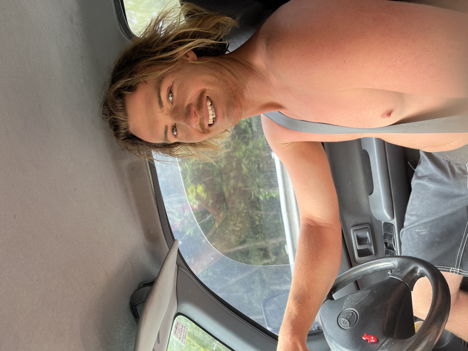 A man with long blond hair sits in a vehicle wearing a seatbelt. He smiles and looks at the camera. He is shirtless, and his skin appears tanned. The vehicle's interior is grey, and a black steering wheel is visible. Outside the window, green trees and foliage are blurred. The image is taken from an unconventional angle, with the top of the vehicle in the lower left corner.