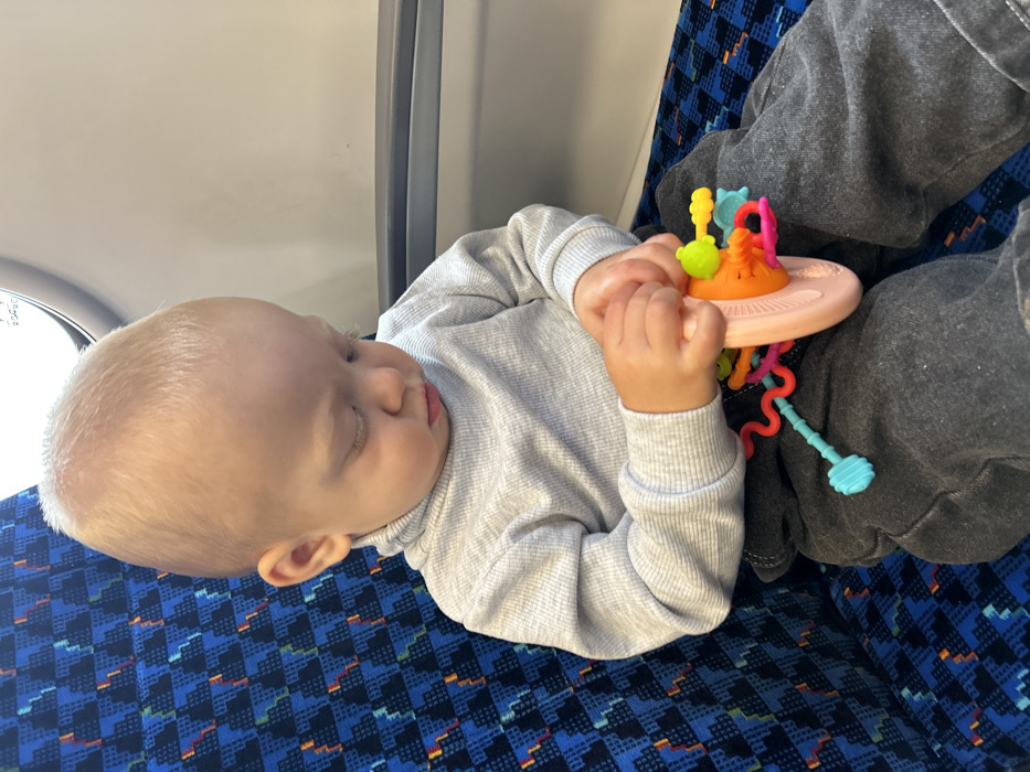 An infant with light blonde hair, wearing a grey ribbed turtleneck shirt and dark grey pants, is seated in a public transport vehicle in Kolomna, Russia