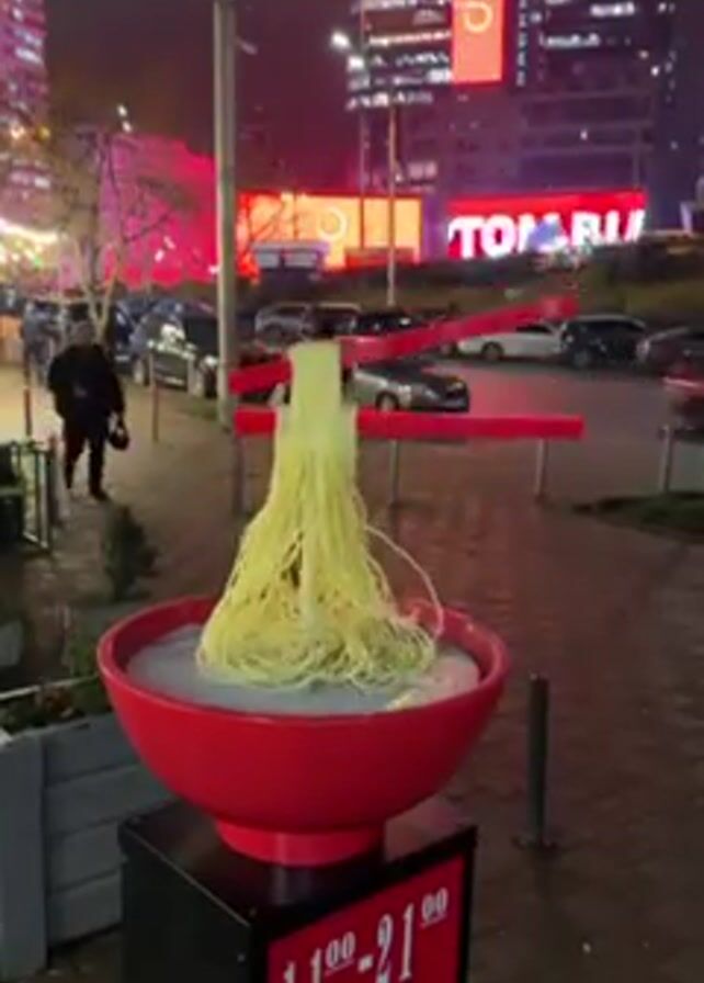 n outdoor art installation in what looks like a city setting at night. The installation features a large red bowl filled with water that seems to bubble. Rising from the center of the bowl is what appears to be a column of yellow noodles, resembling spaghetti or ramen. Above the bowl, red horizontal bars spin around the noodle column, adding a dynamic element to the piece. The installation is placed on a black pedestal that displays the time "11:00 - 21:00" in white numbers. In the background, city traffic moves along a street lined with parked cars and buildings, some illuminated with bright signage. Pedestrians walk along the sidewalk near the installation. The overall environment suggests a commercial or urban district at night.
