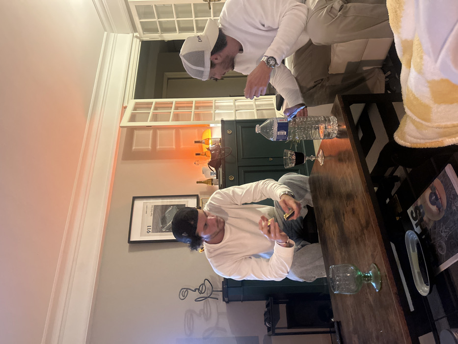 Two people are sitting around a wooden table. The person on the right wears a gray trucker hat, a long-sleeved white shirt, a watch, and khaki pants. The person on the left wears a black baseball cap, a white long-sleeved shirt, and gray sweatpants. They are in a room with a green cabinet behind them and a framed picture of a car on the wall. There are water bottles and wine glasses on the table.