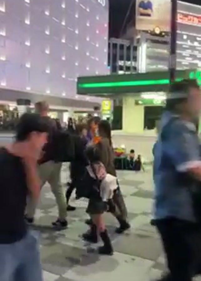 crowded urban street at night. People are walking in various directions across a crosswalk. The buildings are lit up, some with digital displays. One person is wearing an orange costume. The camera moves erratically, suggesting it is held by someone walking through the crowd.