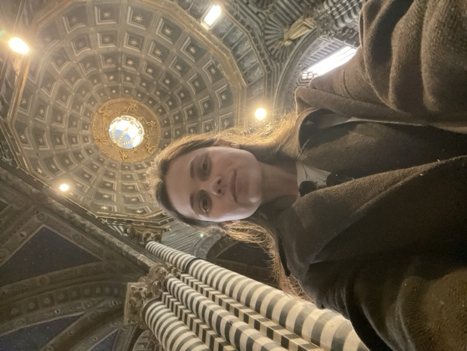 A young adult female is depicted in a low-angle selfie taken inside the Siena Cathedral (Duomo di Siena) in Siena, Italy