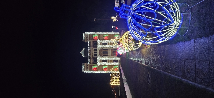 A building, decorated with red, green, and white lights, stands beside large glowing spherical structures. The lights are strung along the building's facade, highlighting its architectural details. The spherical lights, one blue and one yellow, add to the festive atmosphere. The scene is set at night, with darkness surrounding the brightly lit structures. A walkway can be seen in the foreground, reflecting some of the lights.