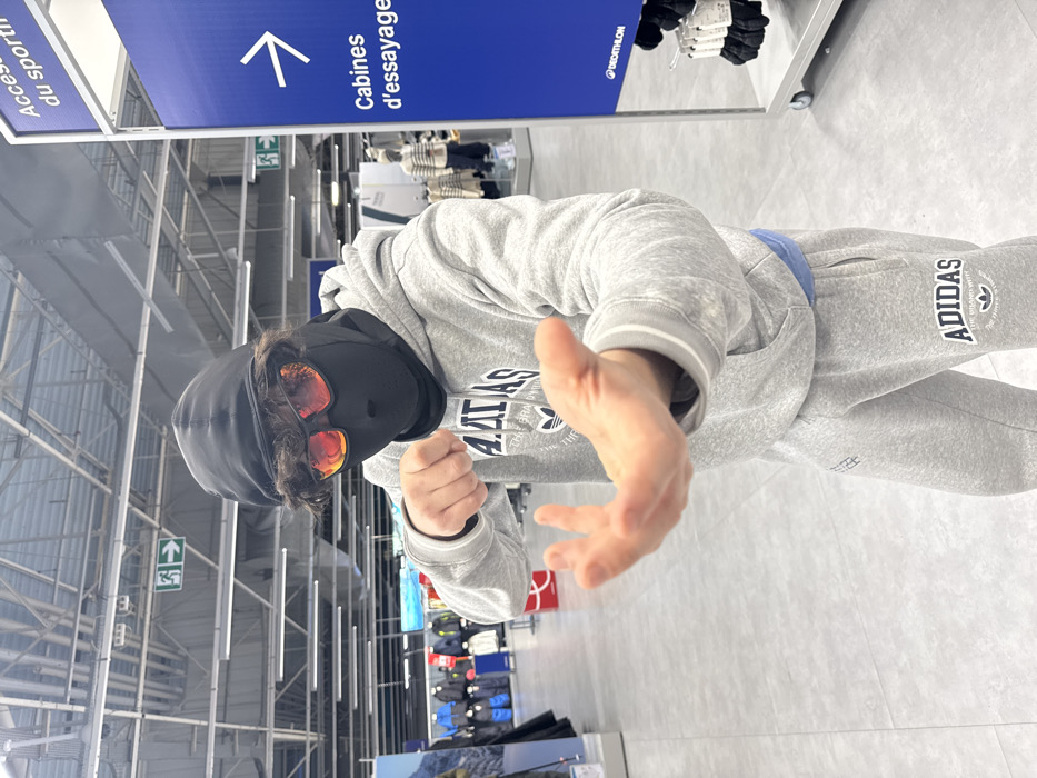 A person wearing a black balaclava and reddish-tinted sunglasses, light gray hoodie, and matching Adidas sweatpants stands inside a large retail store. The person is holding out one hand towards the camera with fingers outstretched, while the other hand is clenched into a fist. Store signs indicate the location of changing rooms and emergency exits. Shelves stocked with clothing and equipment line the background.