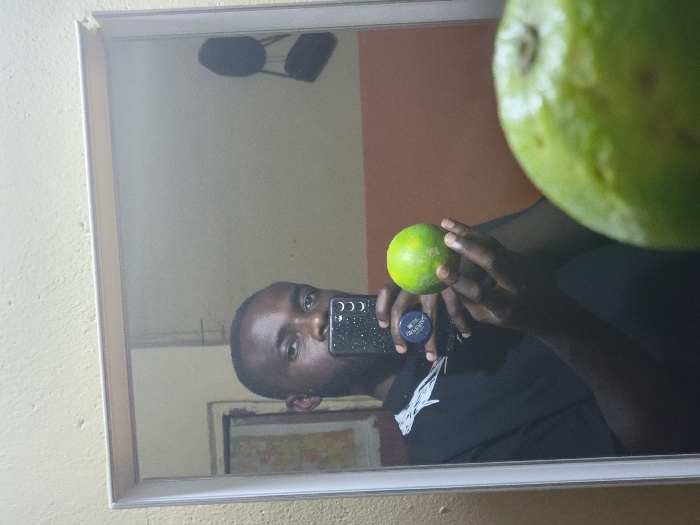 A mirror reflects a man holding a lime and his phone, angled towards the camera. A large green fruit dominates the top right corner, partially obscuring the reflection. The man wears a black shirt, and a black object is visible on the phone. Behind the reflection, the wall is two-toned, beige and orange. A dark object hangs on the beige wall in the upper part of the mirror. The mirror has a white frame.