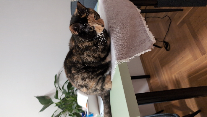 This image displays an indoor scene located in Budva, Montenegro. A tortoiseshell cat with a coat patterned in black, various shades of brown, and hints of orange is positioned centrally on a light green table. The cat is in a resting posture, with its body compact and its front paws tucked beneath itself, its head slightly lowered and turned towards the lower right of the frame. White whiskers are clearly visible on its face. A light grey, textured cloth with visibly frayed edges is partially beneath the cat, draped over the table's edge towards the viewer. To the left on the table, several indistinct objects, including what appears to be white paper and a blue container, are partially visible. A green leafy houseplant stands in the background on the left, set against a plain white wall. The upper right portion of the background shows a blurred blue object, consistent with upholstery. The floor beneath the table is composed of light brown wooden parquet, arranged in a herringbone pattern. Dark-colored table legs support the green tabletop, and a black electrical cable lies on the floor. No individuals are present in the image.