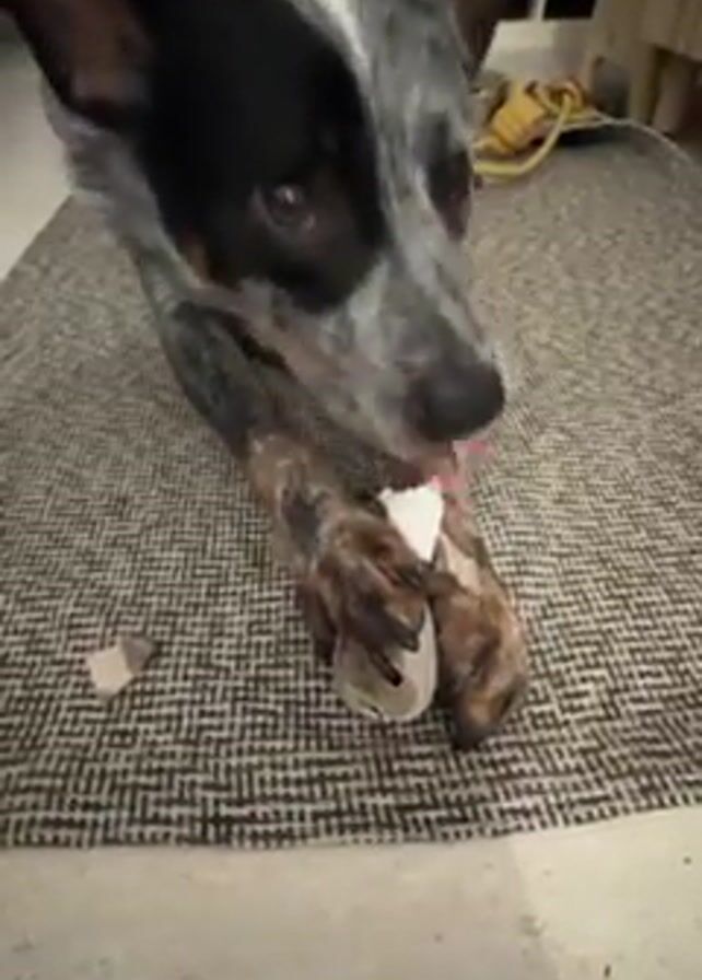 Here is a detailed description of the video: The video shows a blue heeler dog lying on a herringbone-patterned rug. The dog is actively chewing on a white object. Fragments of what appears to be the same material are scattered around the dog. The background includes a dark cabinet with woven baskets, a yellow leash, and a glimpse of what seems to be a curtain. The dog is the main focus of the video, and its activity of chewing is the primary action.