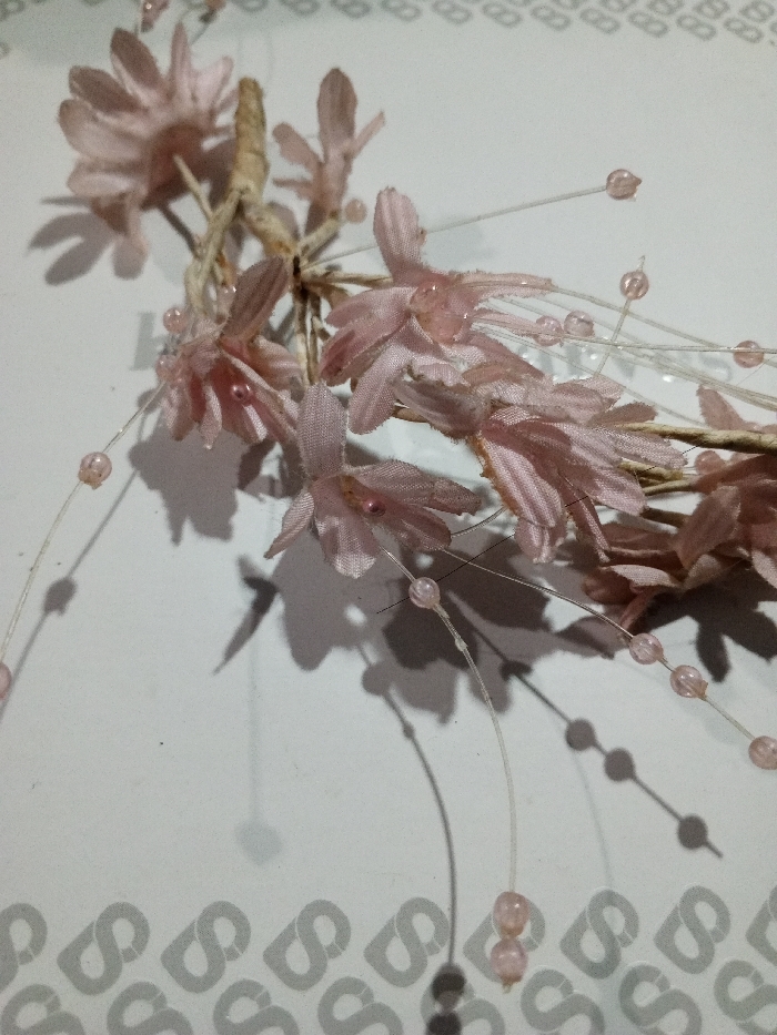 A delicate arrangement of blush-pink fabric flowers and beaded sprigs rests on a patterned surface