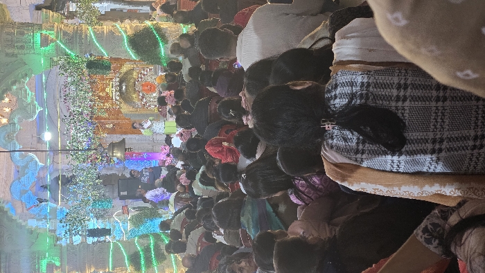 An overhead shot reveals a packed gathering inside what appears to be a temple or religious space. Ornate architecture adorned with green and white lights frames the view. A group of people congregates, heads bowed in prayer. The image is oriented vertically, emphasizing the density of the crowd and the elaborately decorated surroundings.