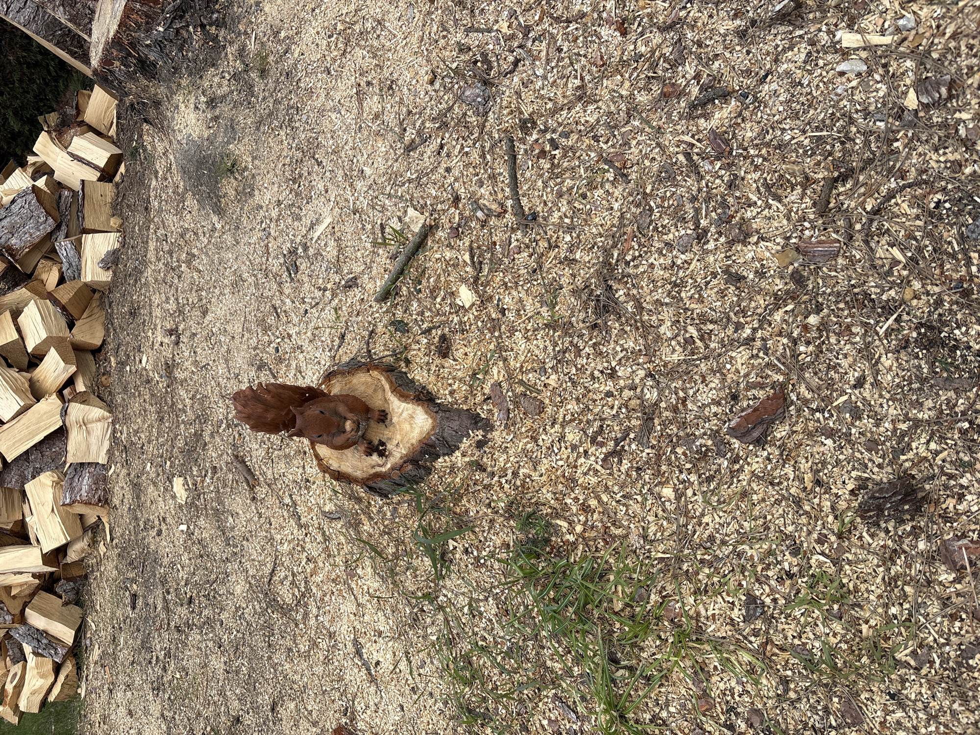 The scene depicts an outdoor ground area in Minsterley, United Kingdom, covered extensively with light-colored wood shavings and sawdust. This ground material is mixed with dark soil, numerous pine needles, small twigs, and fragments of tree bark. Several patches of green grass are visible, primarily in the foreground and immediately surrounding the central object. A reddish-brown carved wooden squirrel sculpture is prominently positioned in the mid-ground, resting on a freshly cut tree stump. The squirrel is depicted in a seated posture, holding a small, spherical object, identifiable as a nut, to its mouth. The tree stump features a light, smooth-cut top surface revealing concentric growth rings, bordered by darker bark. In the background, a large, unorganized pile of split firewood logs, primarily light-colored with some darker bark, is stacked against a darker, indistinct mass that appears to be foliage or another stump. A larger, cut tree trunk section or stump is visible on the far right background edge. No individuals are present.
