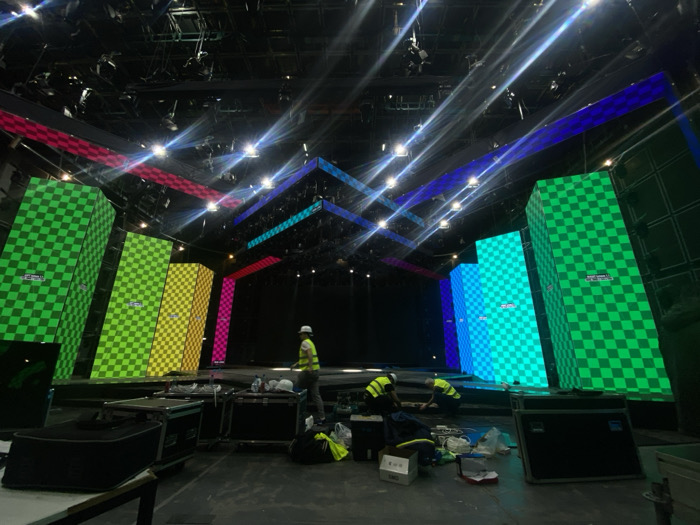 The image depicts an indoor technical setup within a large studio or venue located in Cukarica Urban Municipality, Serbia. The scene features a stage dominated by multiple tall, vertical LED screens displaying checkerboard patterns in various colors, including green, yellow, pink, blue, and cyan. Visible text on some green screens reads "StudioOne" and "E-StudioOne". Above these screens, horizontal LED elements or lighting strips display solid red, blue, and cyan colors. Numerous bright stage lights emit focused beams upwards, illuminating the upper section of the darkly visible ceiling rigging. In the foreground, three individuals are present, appearing to be production crew. One individual stands upright towards the left, wearing a white hard hat, a yellow-green high-visibility vest with reflective stripes, and dark trousers. Two other individuals are kneeling or crouching on the stage floor to the right of the standing person, also wearing similar high-visibility vests and dark clothing. They are positioned amidst various equipment, including dark road cases, cables, and scattered technical components. A crumpled yellow-green garment is visible on the floor near the kneeling individuals. The overall environment is dimly lit, with the bright LED screens and stage lights serving as primary illumination sources. The individuals appear to be engaged in the setup or preparation of the stage and technical equipment.