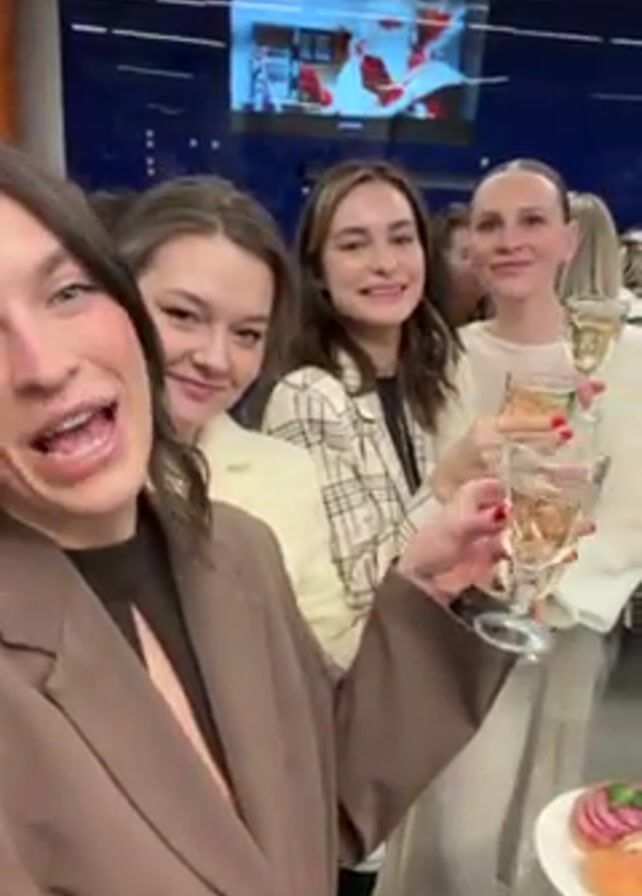 group of four women raising their glasses in a toast. They are standing close together, with the woman in front holding the camera. She wears a brown blazer and has a big smile. The other women behind her wear a white coat, a checkered blazer, and a white sweater. Each of them holds a glass of champagne. A TV screen shows a clip of a man in red with some white trim. There are pastries and salmon on a countertop in the background. Other people sit at tables farther back. The overall atmosphere suggests a celebratory or social gathering.