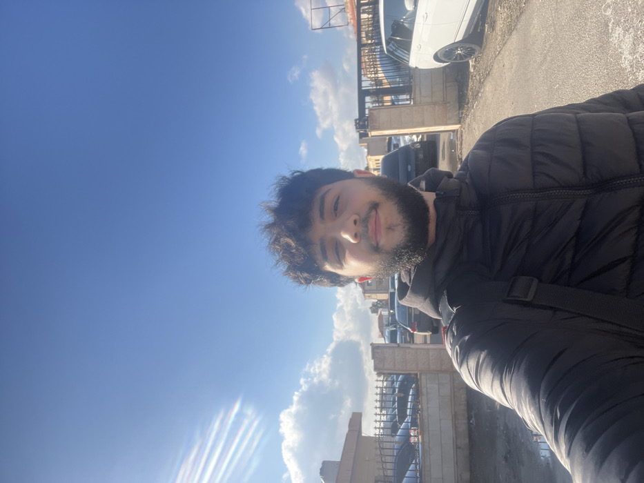 Jaber as-Sirhan, Jordan. A young male, exhibiting dark curly hair and a full beard, is depicted in a close-up, selfie-style photograph. He is wearing a black puffer jacket with a visible zipper and a black strap over his left shoulder. The subject maintains a neutral facial expression, looking directly at the camera. The scene is illuminated by natural daylight under a clear blue sky with scattered white clouds and a prominent sun flare in the upper left quadrant. The immediate foreground features unpaved ground with visible damp patches. In the background, to the left, a low stone wall with a black metal fence surmounts it, separating the foreground from an area with multiple parked dark-colored vehicles and a light-colored building. To the right, an open entrance defined by two stone pillars leads to a visible white SUV and additional distant structures. No other individuals are present or interacting within the frame.