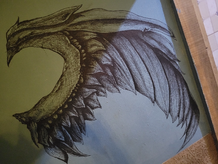 An intricate illustration of a wing dominates the scene. The wing is depicted in dark shades, featuring detailed textures suggesting feathers and a rigid, bony structure. The artwork is set against a muted, greenish-blue background. A portion of a rustic wooden frame is visible, adding a sense of enclosure to the piece. The lighting accentuates the textures, enhancing the depth and realism of the wing.