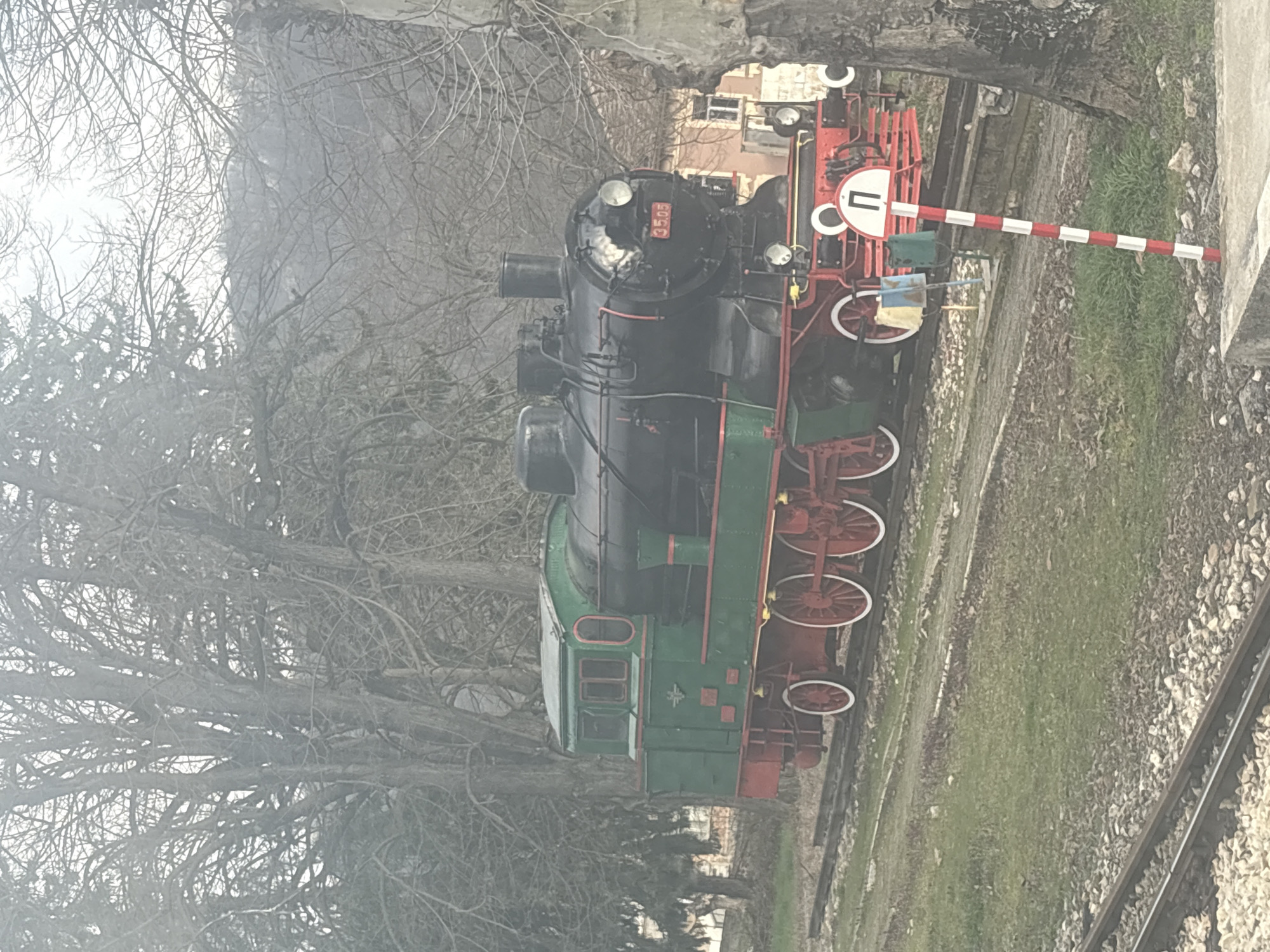 This image depicts a stationary steam locomotive located within the city of Docha, Bulgaria. The locomotive is prominently featured, painted in a scheme of black for the boiler and smokebox, green for the cab and lower body, and red for the undercarriage and wheels, which have white rims. The number "35.05" is visible in red lettering on the front of the smokebox door. The locomotive is positioned on a set of railroad tracks composed of metal rails, wooden ties, and gravel ballast. In the immediate foreground, to the right, a red and white striped signal pole topped with a white semicircular sign bearing a red Cyrillic letter "П" stands upright. The ground is covered with patchy green grass and bare earth. The background consists of a dense arrangement of tall deciduous trees, mostly bare of leaves, indicating a cold season. A light-colored building with windows is partially visible behind the locomotive and trees. Distant tree-covered hills or mountains are faintly discernible through a slight haze under an overcast sky. No individuals are present in the scene.