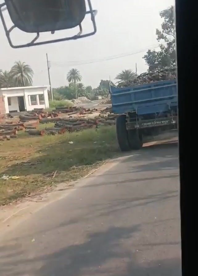 view from inside a vehicle, likely a motorized rickshaw or small truck, moving along a paved road. The scenery consists of a rural landscape with a low white building in the distance, surrounded by a large number of logs scattered on the grass and dirt. As the vehicle continues moving, a blue trailer pulled by a tractor comes into view. The camera zooms in to capture the tractor's model, which is a "Sonalika." The tractor and trailer are parked near the piles of logs, and the video ends with a brief view of the ground as the vehicle continues to move.