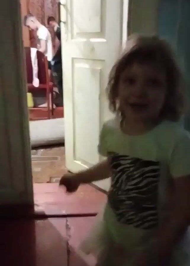 A small child runs from a room, turns, and says something
