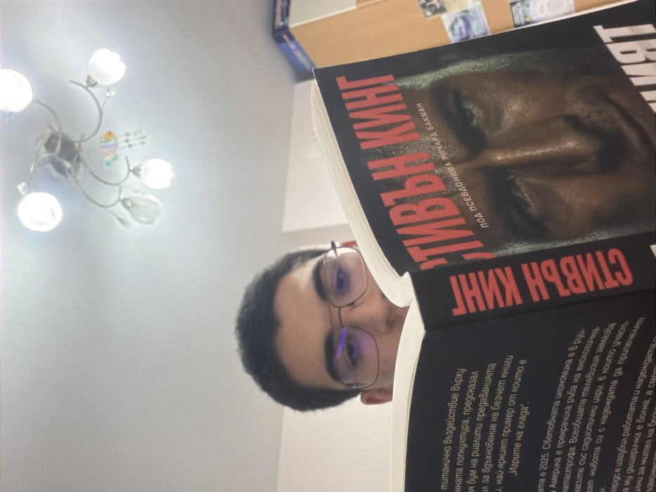 A male individual, wearing wire-rimmed glasses, is positioned in an indoor setting within Varna, Bulgaria, holding and reading an open book. His face, specifically his eyes and forehead, is visible above the open pages, with his gaze directed downwards onto the text. The right page of the open book displays a cover featuring the name "СТИВЪН КИНГ" (Stephen King) in red Cyrillic characters, followed by "ПОД ПСЕВДОНИМА РИЧАРД БАКМАН" (Under the pseudonym Richard Bachman) in white Cyrillic characters. Below this text is a close-up image of a male face with a dark complexion and an intense expression, appearing to be perspiring. The left page of the book contains printed text in Cyrillic script. Above the individual and the book, a white ceiling is visible, to which a five-bulb chandelier with decorative white glass shades and a silver-colored metal frame is attached. A small, multicolored, fish-shaped ornament hangs from the chandelier. In the upper right quadrant of the image, a segment of a brown furniture piece, possibly a cabinet or shelf, is visible, with a blue object partially resting on it.