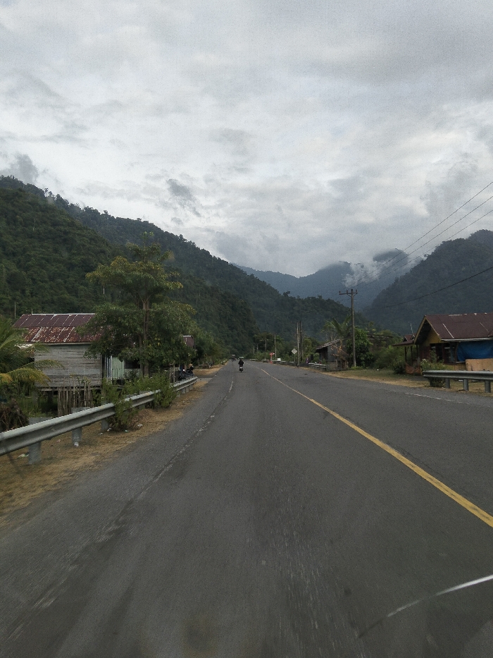 An outdoor, long-shot photograph depicts a two-lane asphalt road traversing a rural, mountainous landscape in Meunasahcot, Indonesia, under an overcast sky