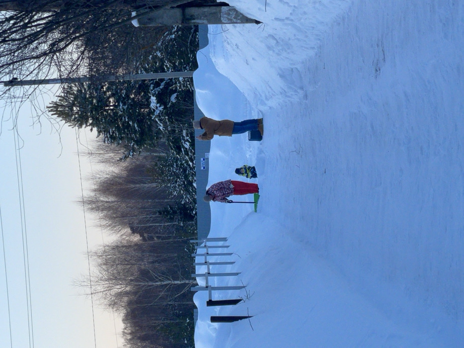 The image presents an outdoor winter scene on a snow-covered path or street in Zav'yalovo, Russia