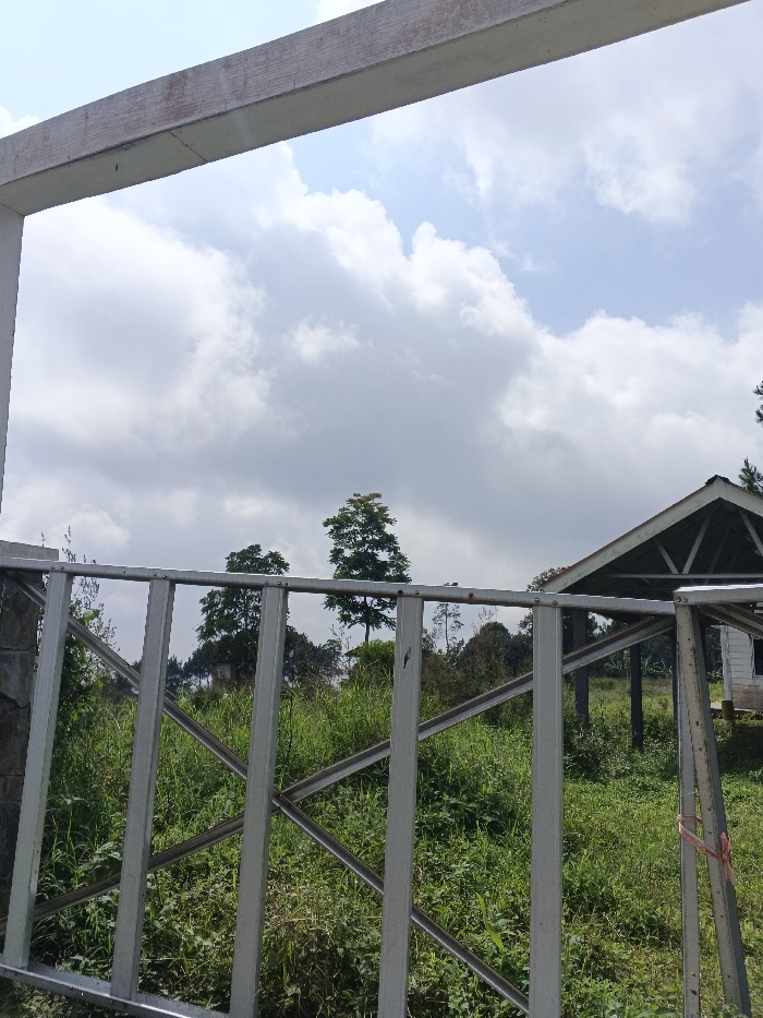 A landscape framed by a concrete structure and a metal fence. Lush green vegetation fills the midground, punctuated by tall trees. A structure with a peaked roof is partially visible on the right side of the frame. Above, the sky is filled with white clouds under a bright blue sky. The view is obstructed by the metal fence, partially obscuring the landscape.