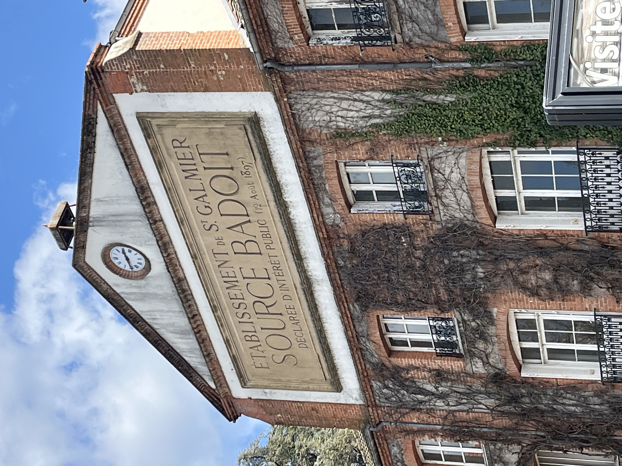 building with a sign that reads "ÉTABLISSEMENT DE S. GALMIER SOURCE BADOIT" and "DÉCLARÉE D'INTÉRÉT PUBLIC (12 Août 1897)". The building is made of brick, partially covered with ivy, and has several windows with decorative iron railings. A clock is placed on the building's gable. A sign indicating a visit is on the right. The blue sky and some clouds are visible in the background. This is located in the city of Saint-Galmier, France.