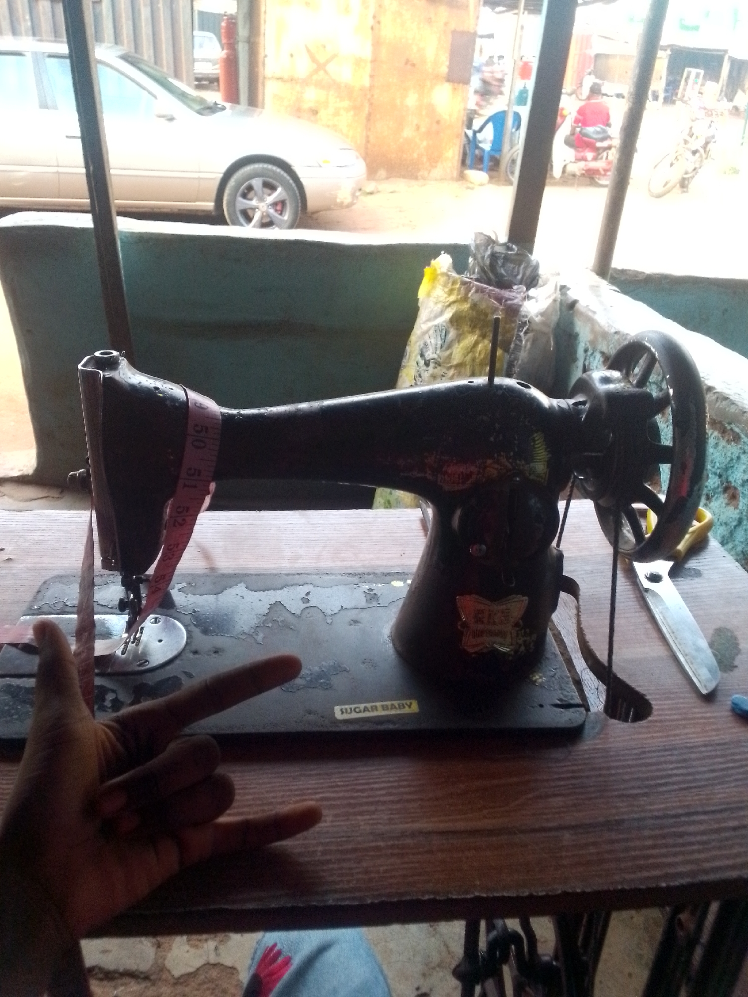 vintage black sewing machine with a pink measuring tape draped around its neck. A hand is in the foreground, making a gesture. A pair of scissors is near the sewing machine on a wooden table. In the background, partially visible, there's a car, a building, people on motorcycles, and a possible commercial area. Given the user's prompt, the image is likely captured in Orlu, Nigeria.