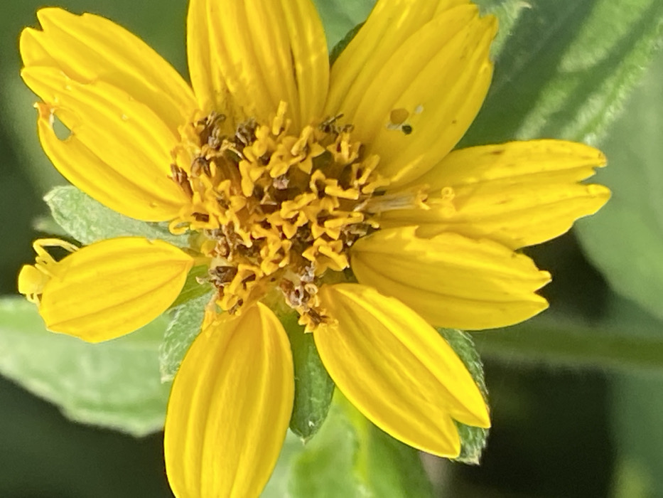 A close-up photograph captures a vibrant yellow composite flower, presumed to be located in Achara, Nigeria. The flower occupies the majority of the frame, featuring numerous elongated yellow ray florets arranged around a central disk composed of tightly packed, small yellowish-brown florets. A pale yellow crab spider is positioned atop one of the upper-left ray florets, its legs splayed, exhibiting camouflage against the petal's surface. Minor imperfections, including small holes and dark spots, are visible on several petals. The background consists of out-of-focus green foliage, indicative of a natural, outdoor environment. The scene is illuminated by natural light.