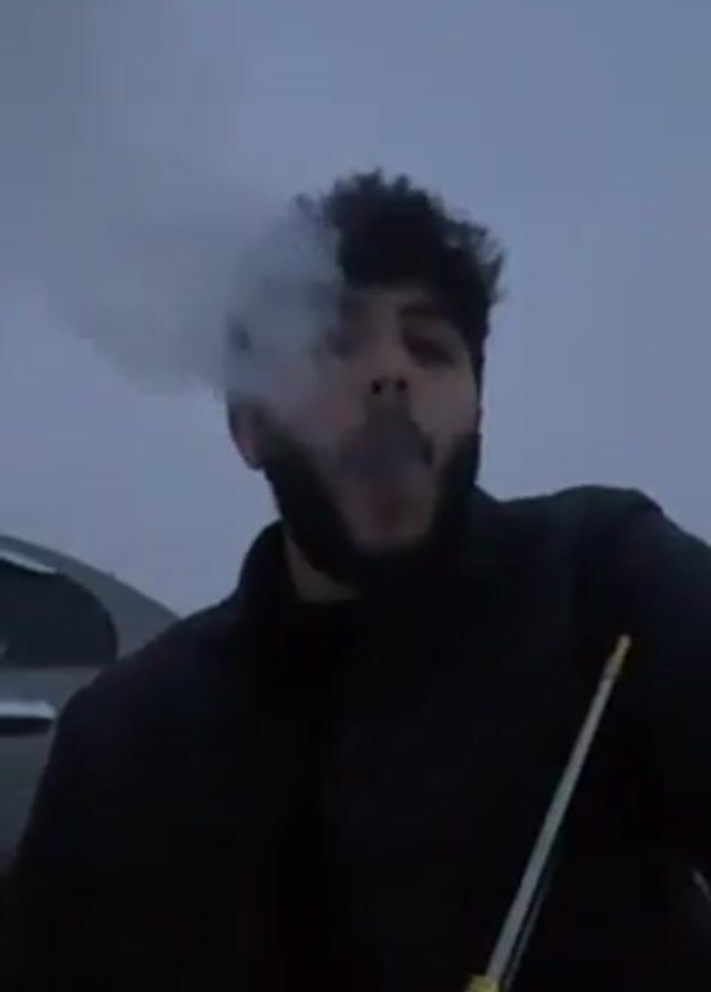 A low-angle shot shows a dark-haired man with a beard exhaling a large cloud of vapor into the overcast sky