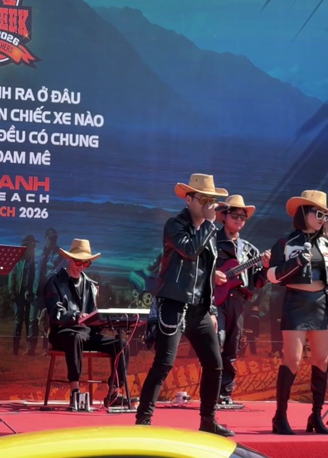 band performing on a stage outdoors. Four people are visible on stage: a male singer wearing a black leather jacket, black jeans with a chain, a cowboy hat, and sunglasses. To the right of the singer is a man playing an electric guitar, also wearing a cowboy hat. Next to the guitarist is a woman wearing a black leather jacket and skirt, boots, a cowboy hat, and sunglasses, singing into a microphone. To the left of the singer is a man seated and playing a keyboard; he is wearing a cowboy hat and sunglasses. Behind the band is a large backdrop with text in Vietnamese, and a blue graphic of mountains and the ocean. In front of the stage, a yellow sports car is partially visible. The ground appears to be red.