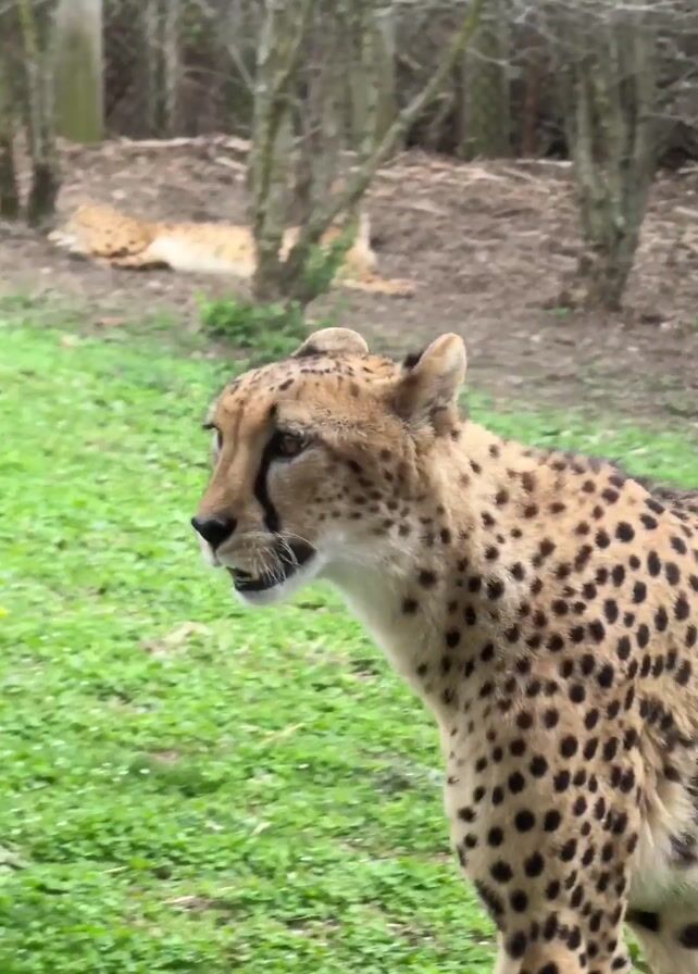 cheetah standing in a grassy area, then walking to the left of the frame. The cheetah has a tan coat with black spots, and a white throat. There is a wooden building and a wooded area in the background. Another cheetah is lying in the background behind the standing cheetah.