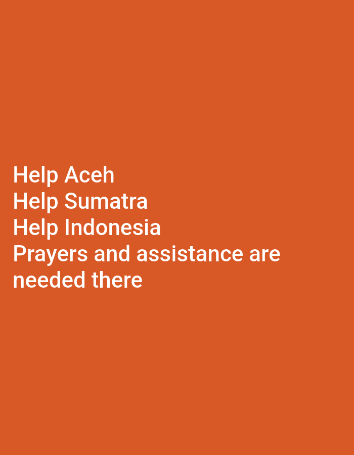 The image displays a digital graphic with a solid orange background. White sans-serif text is centered vertically and left-aligned within the lower portion of the frame. The text reads: "Help Aceh," "Help Sumatra," "Help Indonesia," and "Prayers and assistance are needed there." No physical scene, individuals, or objects beyond the text and background are depicted. No actions or interactions are visible. The image does not represent a specific physical location in the city of Lhokseumawe, Indonesia, or any other geographical area; it is a static, text-based visual message.