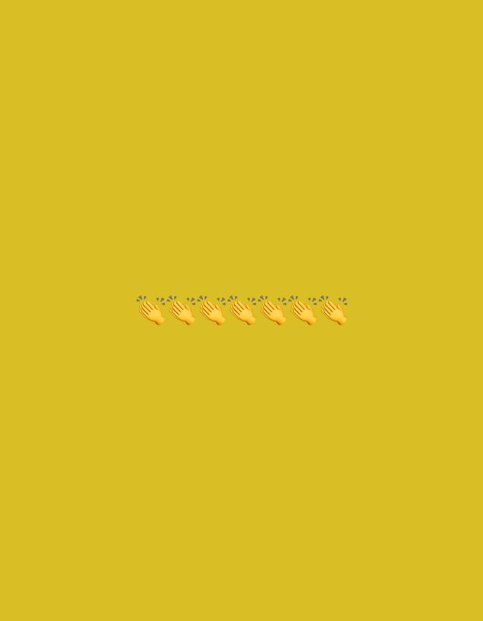 A plain yellow background fills the image. Centered horizontally and positioned at the vertical midpoint are six yellow clapping hands emojis in a row. Each hand is depicted in a prayer position, with sound waves emanating from their striking palms. The spacing between each clapping hands emoji is uniform.