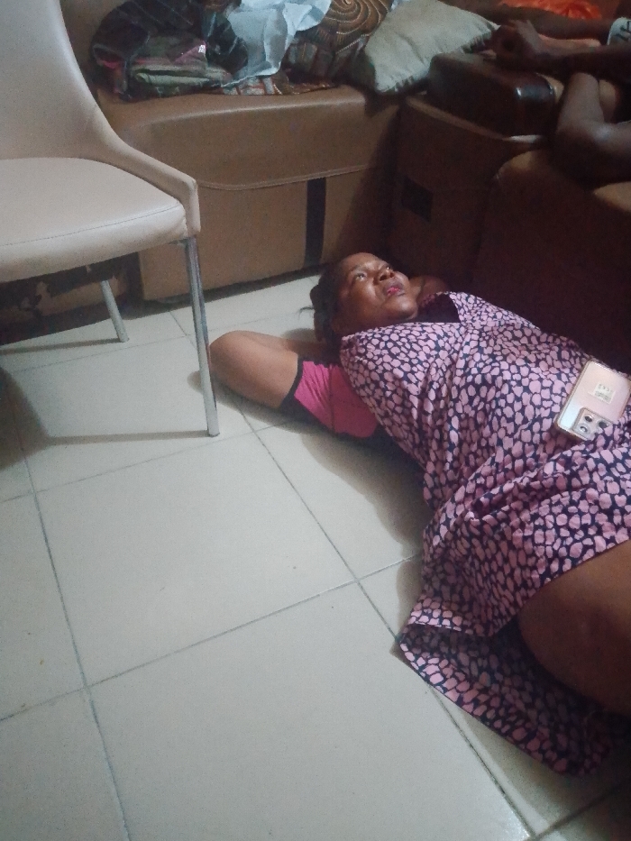 A woman lies on a tiled floor, leaning against a brown couch. She wears a pink and dark blue patterned dress over a pink shirt, with her arms behind her head. A cell phone rests near her side. A beige chair sits to her left. The couch, positioned behind and to her right, has visible brown cushions and what appears to be a leg extending from the top right corner. The woman gazes upward, her face visible in the scene.