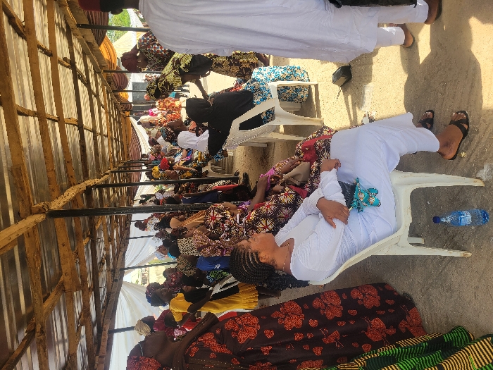 The image depicts an outdoor gathering in Kwali, Nigeria, beneath a temporary shelter composed of a corrugated metal roof supported by wooden beams and dark metal poles