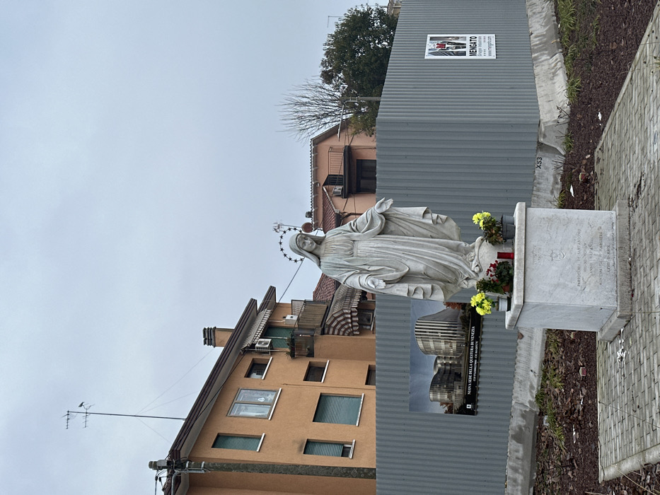An outdoor scene in Marghera, Venice, Italy, depicts a white marble statue of the Virgin Mary under an overcast sky