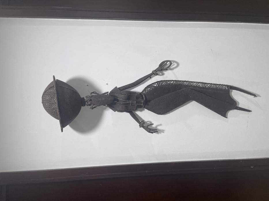 A dark, stylized metallic sculpture of a female figure is centered on a white wall in Falomo, Nigeria, flanked by dark brown door frames. The sculpture balances a textured, perforated bowl-shaped object on its head. Its slender body features layered elements resembling clothing, and its arms are extended. Both wrists are adorned with bangles, while the figure's right hand (viewer's left) grasps a circular, looped object. The lower body forms a flowing skirt, intricately patterned with geometric shapes on its left side (viewer's right), and terminates in two pointed extensions, indicative of a wall-mounted artwork. Overhead lighting casts a distinct shadow of the sculpture onto the wall behind it.