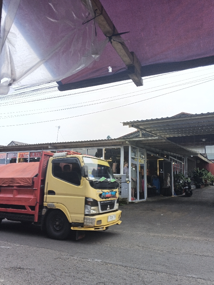 The image captures an outdoor street scene in Tasikmalaya, Indonesia, under an overcast sky. In the upper foreground, a maroon-colored tarp or awning is visible from below, secured by black zip ties to two horizontal wooden beams. A clear plastic sheet is also attached to this structure. On the asphalt road, a yellow light-duty truck with a red flatbed, covered by a red tarp, moves from left to right across the midground. The truck's front bumper is yellow, and blue and white graphic elements are visible on its grille. A white license plate is partially discernible on the lower front. Across the road from the truck, a commercial building features a facade predominantly composed of large glass windows and an open doorway. Above the windows, several brand names including "ZARA," "Levi's," "VAN," and "Diesel" are displayed. Inside the establishment, various items of clothing are exhibited. Near the open doorway, a figure, possibly a mannequin or an individual, stands dressed in a light-colored shirt and shorts. Further inside, a second individual, wearing dark clothing and a head covering, is partially visible. To the right of the building, on an elevated paved surface, at least two motorcycles are parked. Green foliage is present adjacent to the building. The background shows multiple low-rise structures with corrugated roofs and numerous dark utility wires strung horizontally against the bright, hazy sky.
