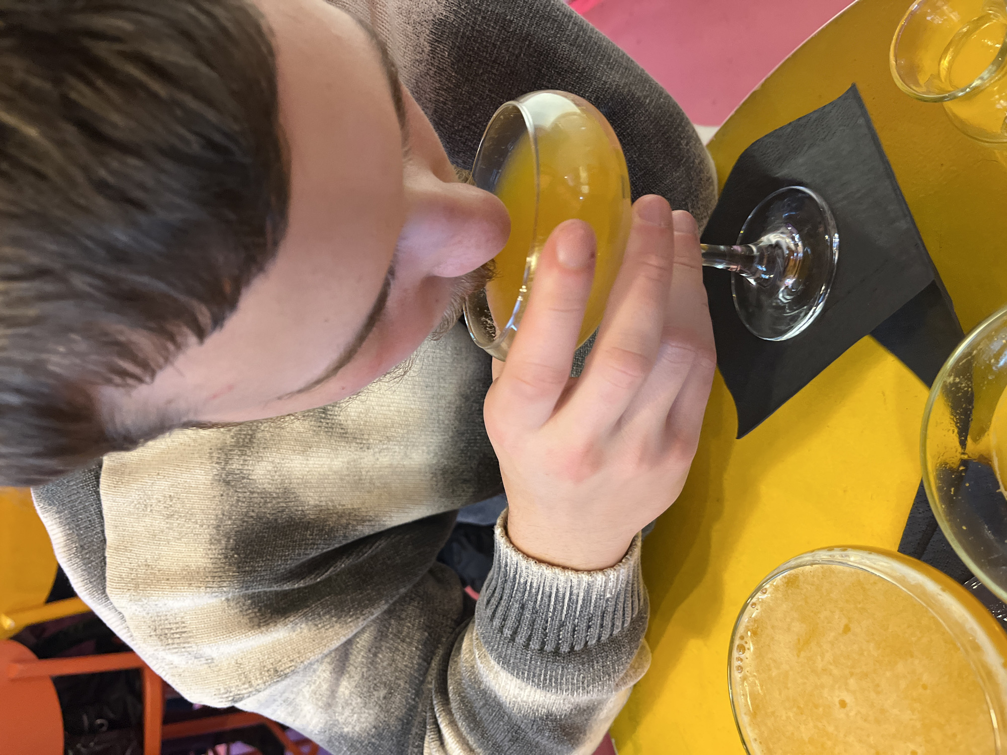 - "A close-up shot depicts a fair-skinned man drinking a yellow liquid from a stemmed glass at a yellow table" by FM-KDHk83, licensed under CC BY 4.0