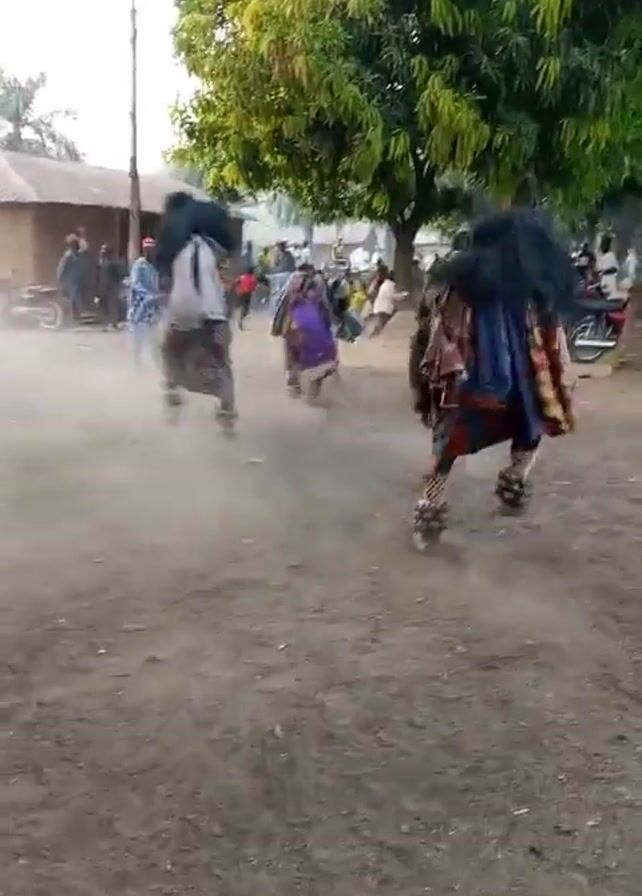 three people in costumes dancing in a dusty area, kicking up dirt as they move. The costumes appear to involve fringed elements and masks with hair-like coverings. There is a crowd of onlookers in the background, some wearing blue clothing. A building with a corrugated roof is also visible. A large tree provides some shade over the area. Two motorcycles are parked on the edge of the crowd. The overall setting seems to be a village or rural area.