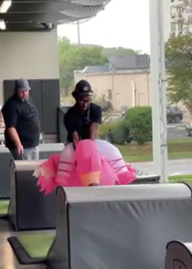 The scene is a Topgolf facility, likely an indoor or covered area. A young African-American man wearing a black shirt, white pants, glasses, and a baseball cap is riding a large, inflatable pink flamingo. He is bouncing on the flamingo as if riding a horse. To his left, an older Caucasian man in a black shirt and grey hat is standing nearby, seemingly watching. Golf bays are visible around the flamingo rider. Outside, there is a view of a building, some greenery, and a road with a car driving by. Artificial light fixtures are visible above, as is netting on the ceiling. The overall setting suggests a casual, lighthearted atmosphere at the golf entertainment complex.