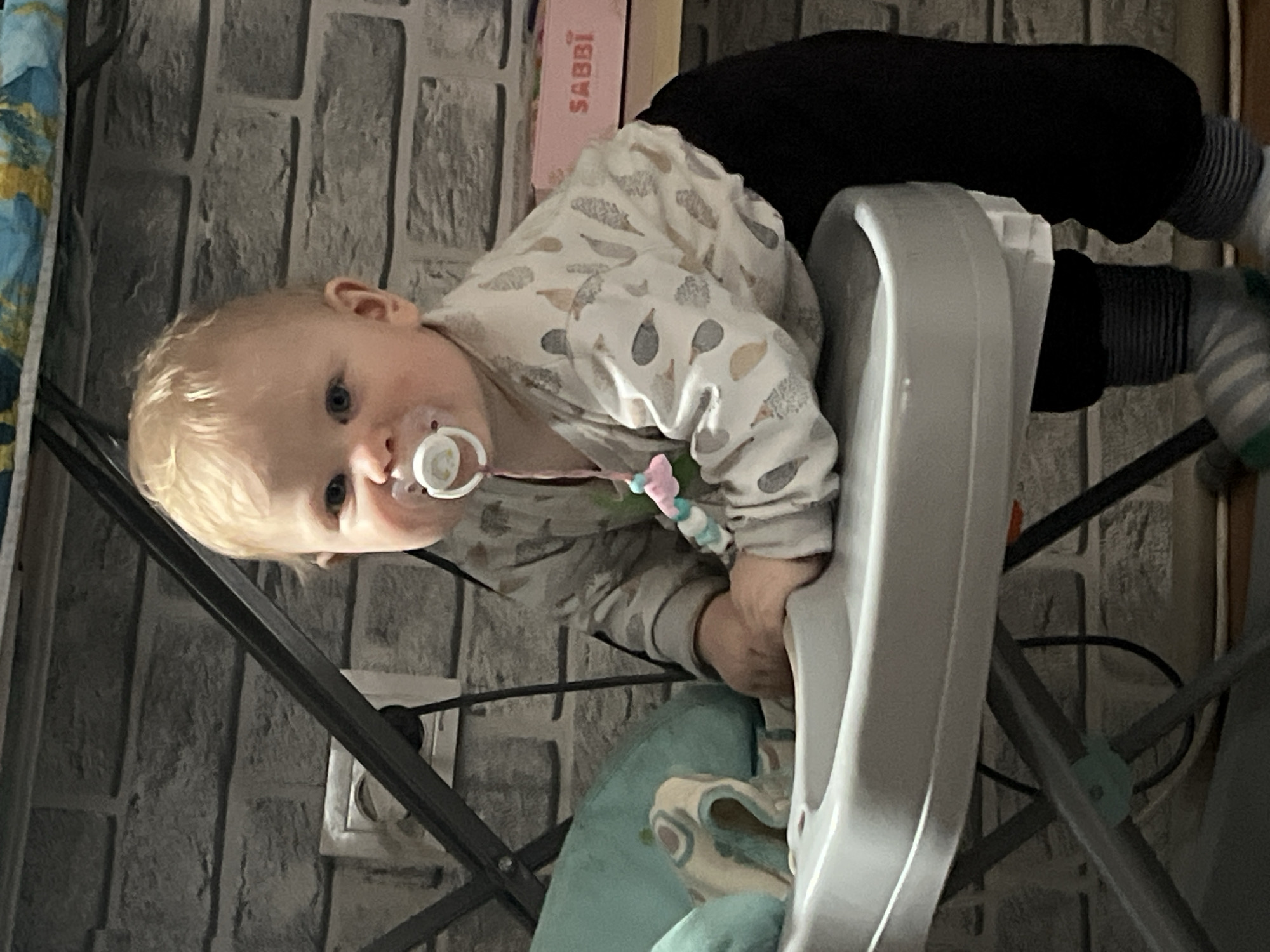 In an indoor setting in Vesyoloye, Russia, a fair-skinned infant with blonde hair and blue eyes is captured in a front-facing, waist-up portrait. The infant, appearing to be between 6 and 18 months old, stands leaning forward with both hands resting on the light gray plastic tray of a baby activity center or walker. A white pacifier is held in the infant's mouth, connected by a multicolored beaded clip. The infant wears a light-colored long-sleeved shirt patterned with gray, brown, and light blue feather or leaf shapes, dark pants, and striped socks (one green-striped, one gray-striped). The background consists of a gray wall with a brick-like texture. An electrical outlet is visible on the wall to the upper left. To the infant's left, a light blue cushion and a patterned cloth item rest on the activity center's tray. To the infant's right, a pink box labeled "SABBI" is positioned on a light brown surface. Overhead, a blue and yellow patterned fabric is partially visible.