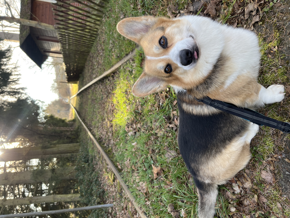 - "The image depicts an outdoor scene in Raumbach, Germany, featuring a tri-color Pembroke Welsh Corgi positioned on a grassy surface sparsely covered with brown fallen leaves" by FM-4GKkh1, licensed under CC BY 4.0