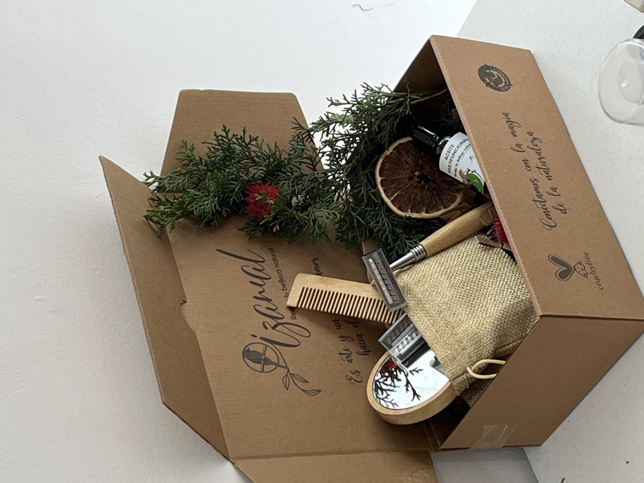 An open cardboard box reveals a curated gift set