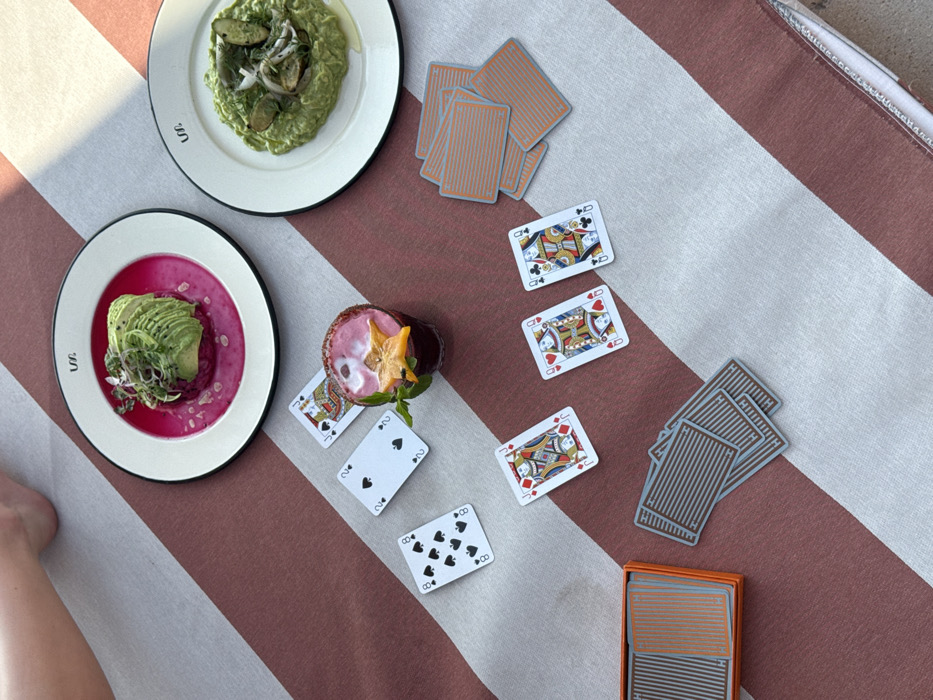 Two plates of food, one with green and one with red and avocado, sit beside a cocktail with starfruit. Playing cards are scattered across a striped blanket, including a King of Diamonds, Queen of Diamonds, King of Clubs, a pile of face-down cards, and a 2 of Spades. An open card case is on the far right. A person's leg is visible on the left.